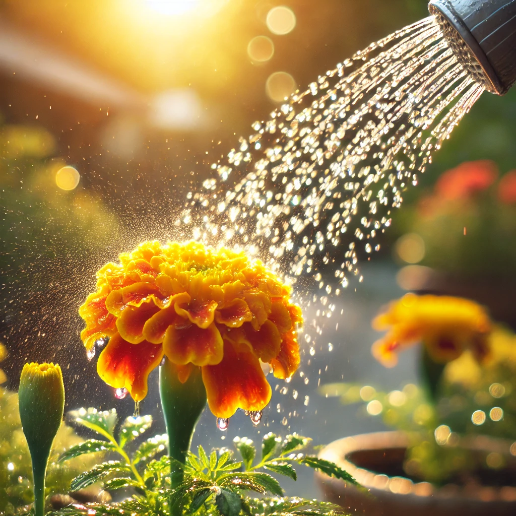 Watering a marigold flower